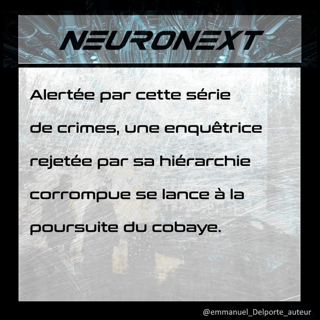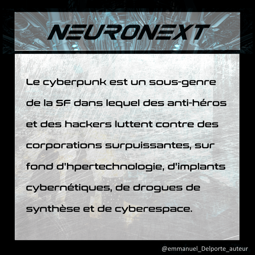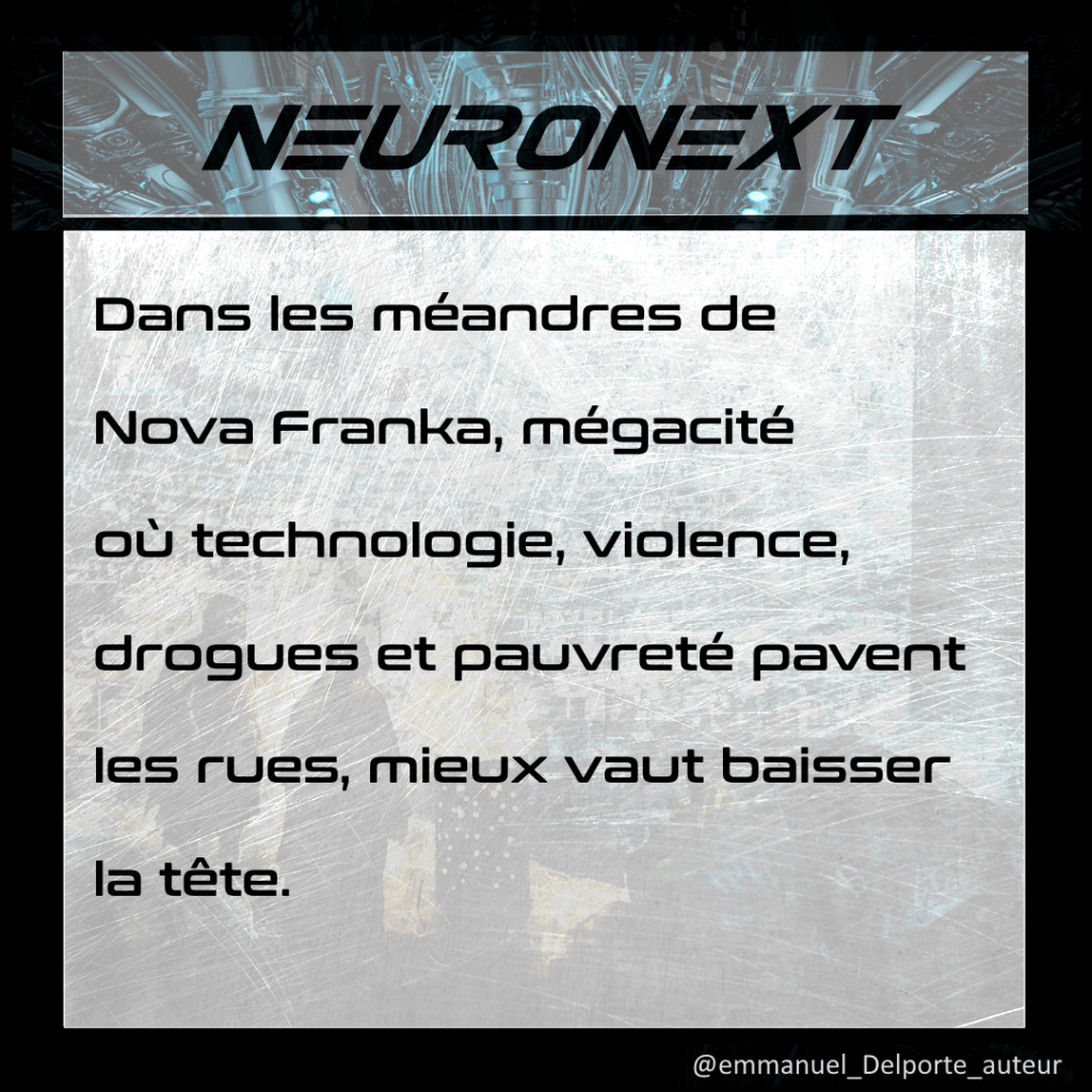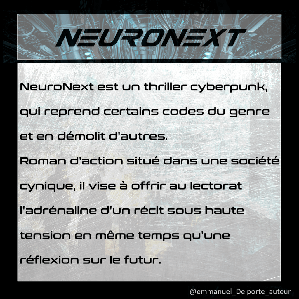 NeuroNext est un thriller cyberpunk, qui reprend certains codes du genre et en démolit d’autres. Roman d’action situé dans une société cynique, il vise à offrir au lectorat l’adrénaline d’un récit sous haute tension en même temps qu’une réflexion sur le futur et sur le rôle des IA.