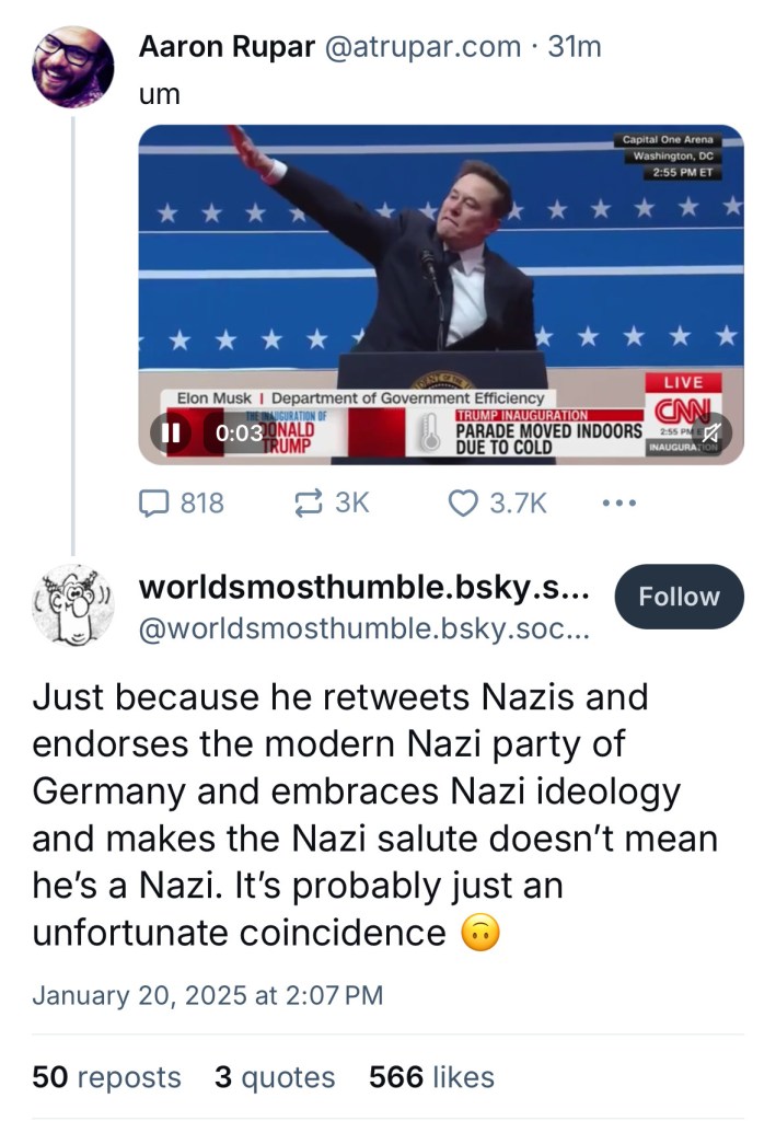 Une petite virée dans les commentaires des supporters Trumpistes nous confirme que le fameux « common sense » dont les abreuve leur idole ne s’applique pas à eux. (Non, pour eux, ce n’est pas un salut nazi.) De toute manière, « Hitler était communiste », c’est le maître Elon Musk qui l’a dit. Et comme c’est un génie, il a raison. Je contre :